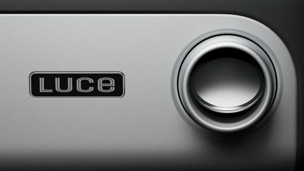 At first glance, the Luce’s interior appears deceptively restrained. A central digital binnacle, a three-spoke steering wheel and a standalone infotainment display sit within an aluminium architecture that feels sculptural rather than decorative. Four precision-machined air vents punctuate the dashboard. There is no visual clutter.