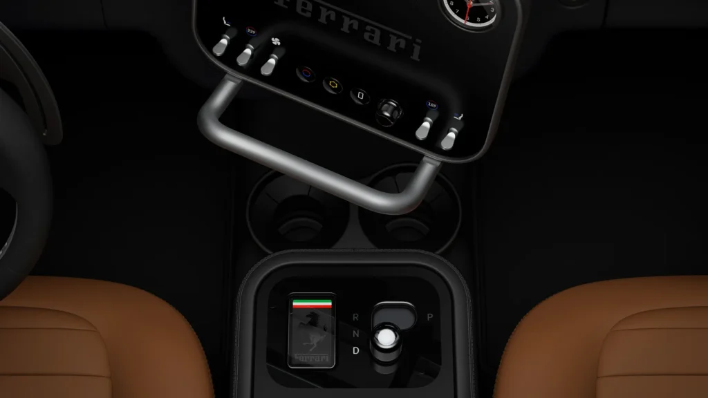 The key itself sits in a magnetic dock beside the shifter. Inserted into place, its signature Ferrari yellow transitions to black using e-ink technology, triggering an orchestrated lighting sequence across the displays.